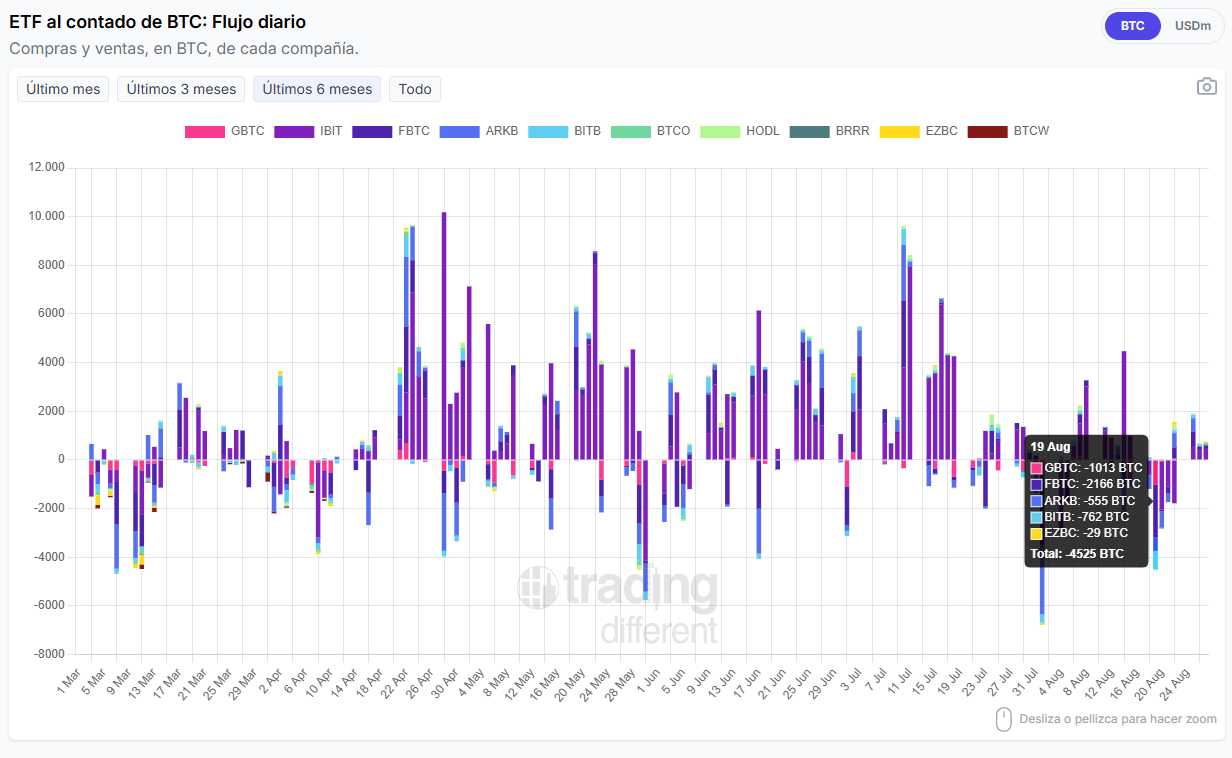 El análisis del flujo diario de ETF de BTC también aporta datos clave. En las últimas semanas se observa una clara reducción en el volumen de compras, y varios días con ventas destacadas. Por ejemplo, el 19 de agosto se registró un saldo neto vendedor de 726 BTC, liderado por FBTC con 2166 BTC vendidos, seguido por GBTC con 1013 BTC, ARBK 555 BTC, BITB 762 BTC, y EZBC 29 BTC (figura 3).